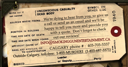 Smoking Gun Entertainment is a growing Canadian Company made up of writers, performers, improvisation artists and comedians. We are one of the oldest murder mystery companies in the country, sleuthing since 1987.